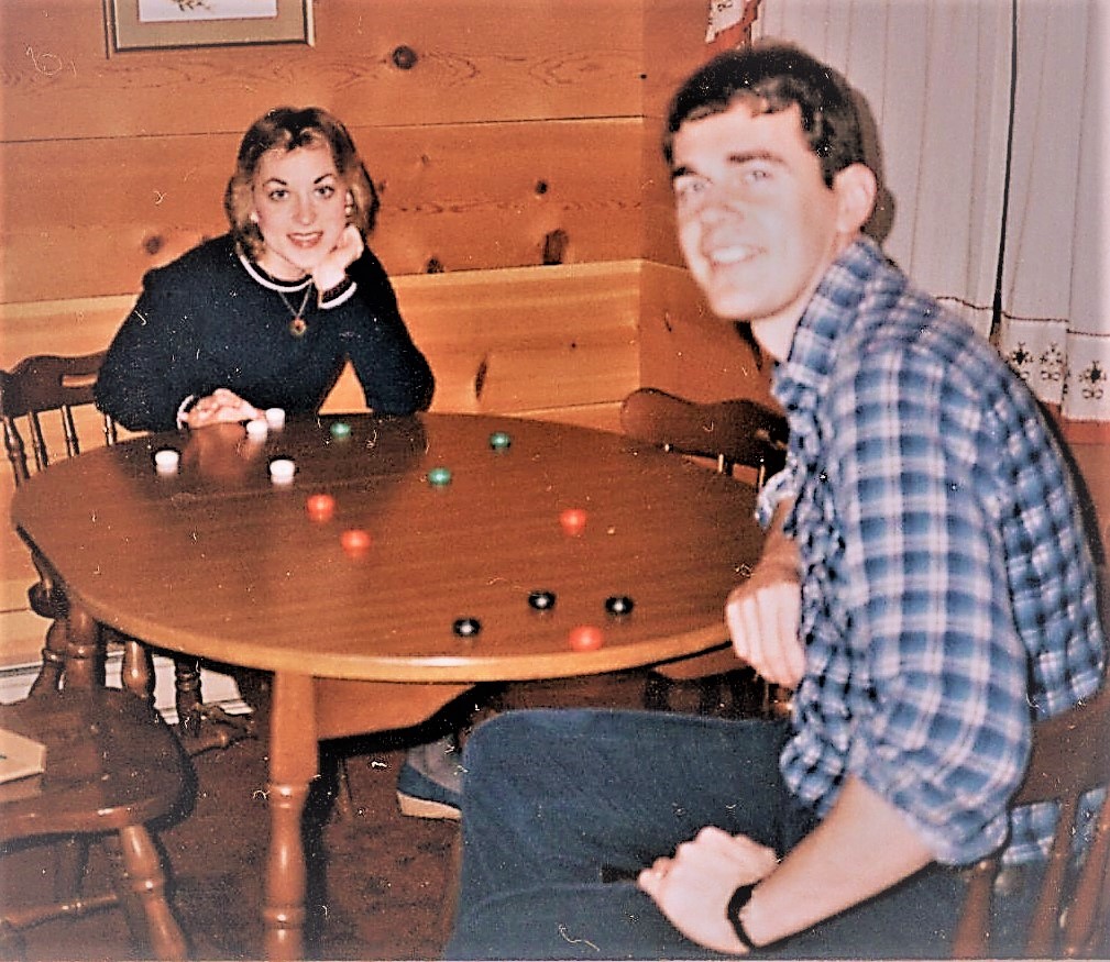 Tim and me in our honeymoon cabin in Helen, Georgia, playing one of the games he invented. This one is called “Slide.”