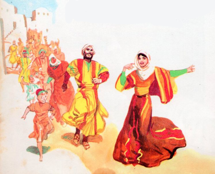 The woman of Samaria (the woman at the well) comes running to Jesus, bringing townspeople with her. Illustration by Kreigh Collins