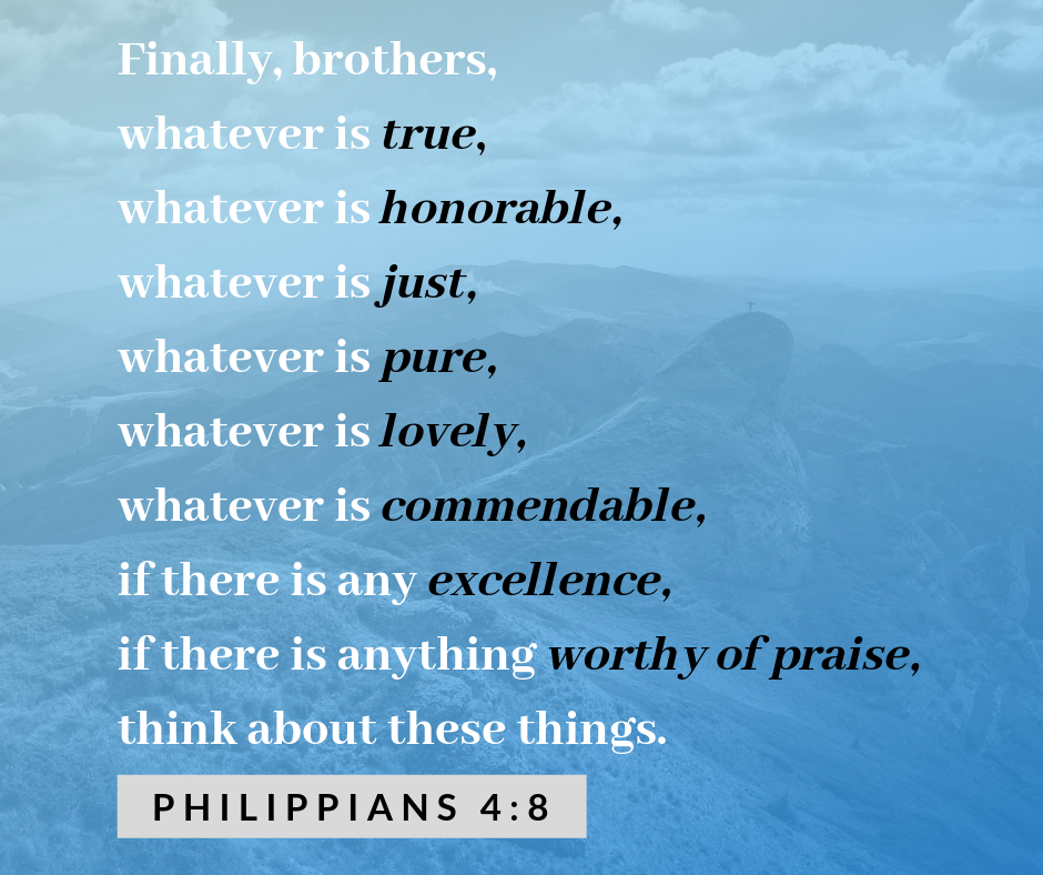Beautiful verse, right? A wonderful reminder to set our minds on things above, the way Colossians 3:5 talks about. Because who or what could be more honorable, just, pure, lovely, commendable, excellent, and worthy of praise than our King and Lord, our Savior and Good Shepherd, Jesus Christ? Through the Scriptures as we ask the Holy Spirit to open our eyes to Him and His truth, we see Him more and more clearly, and we marvel at His holy love. No matter how much we meditate on Him and His goodness, there is still more.